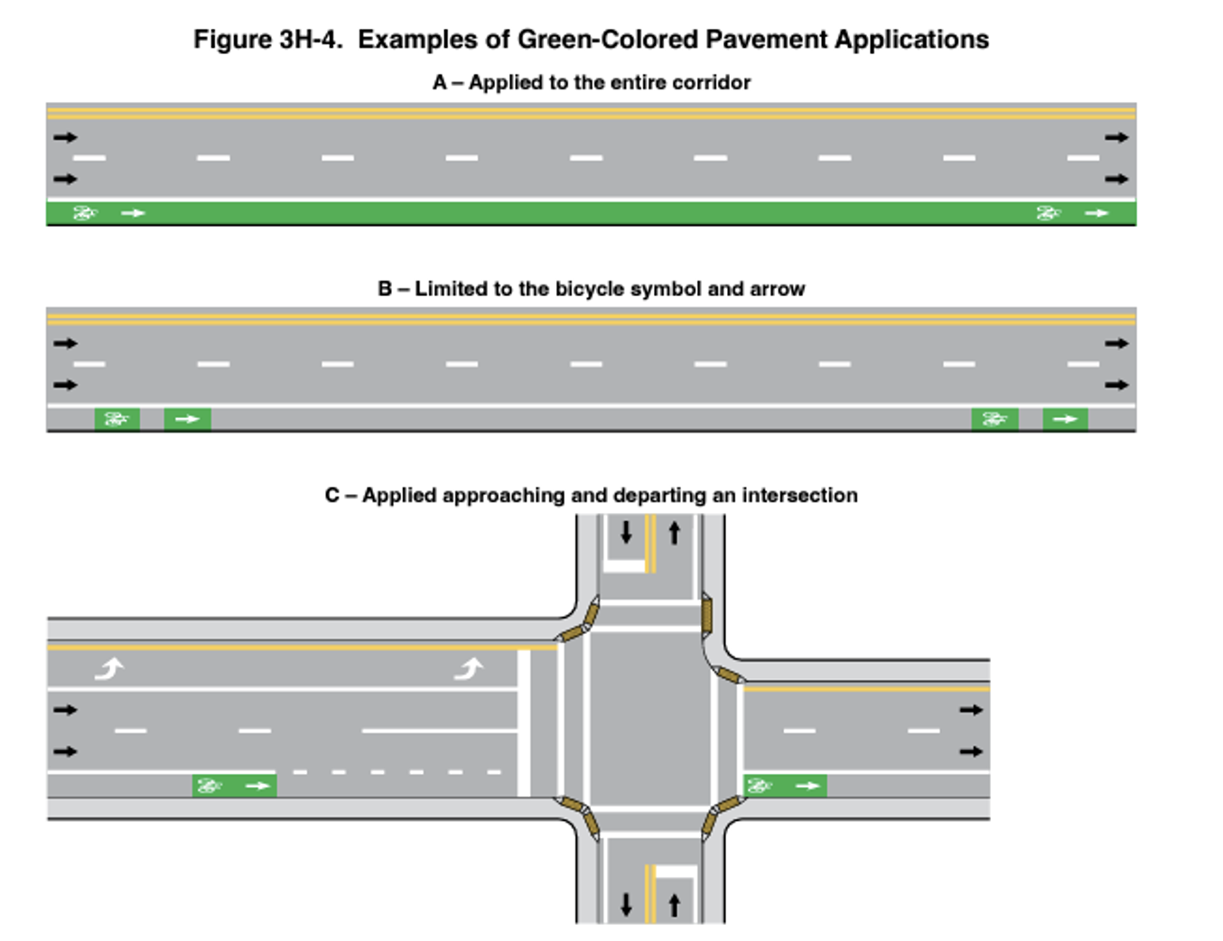 - Green pavement may be used on designated bike routes and roadways with higher levels of bicycle activity.