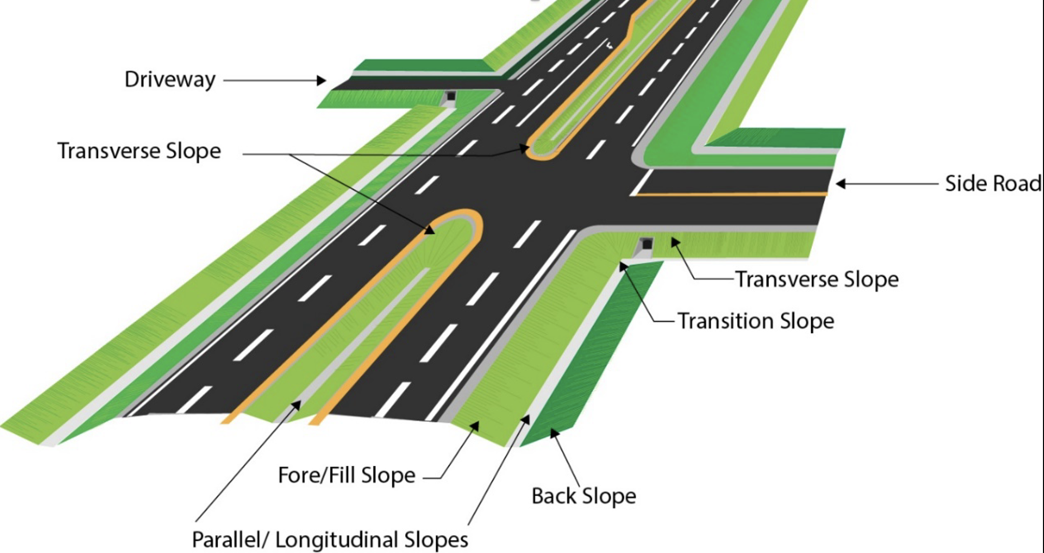 Foreslopes, or fill slopes, are parallel to the flow of traffic and are the front or negative slopes that usually hinge from the roadway’s shoulder. The backslope is a positive slope that extends upward from the base of the foreslope or toe of the ditch. Transverse slopes are not parallel to the roadway and are usually created by median crossovers, berms, driveways, or intersecting roadways.