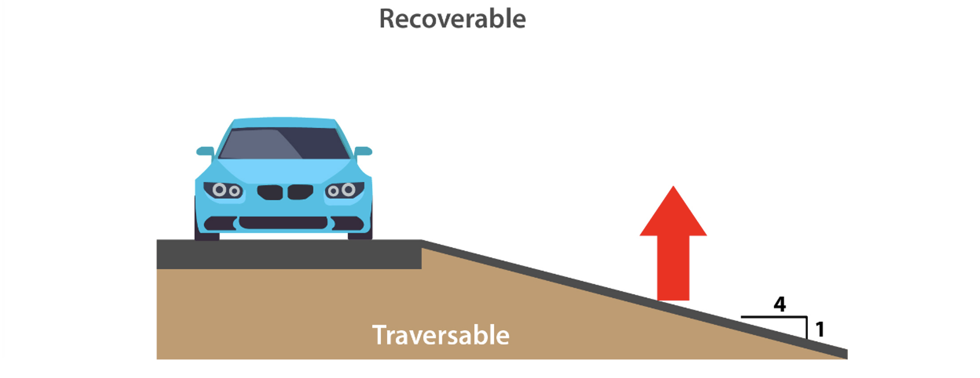 Slope flattening reduces the steepness of the side slope and depressed median so that errant motorists are more able to keep their vehicles stable, regain control, and avoid obstacles. Slopes of 1V:4H or flatter are considered recoverable (i.e., motorists can retain control of a vehicle by slowing or stopping). Slopes between 1V:3H and 1V:4H are generally considered traversable, but non-recoverable (i.e., the errant vehicle will continue to the bottom of the slope).